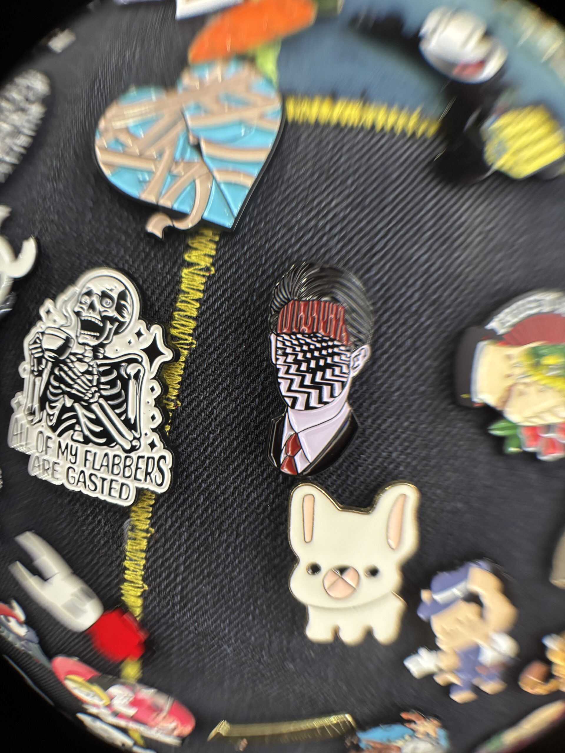 Pin de acero esmaltado con diseño surrealista, figura masculina.