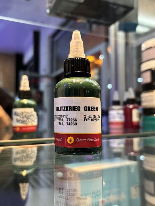 Blitzkrieg Green es una tinta profesional para tatuaje de verde intenso y agresivo, diseñada para piezas de alto impacto visual. Su saturación sólida garantiza un color potente y duradero.