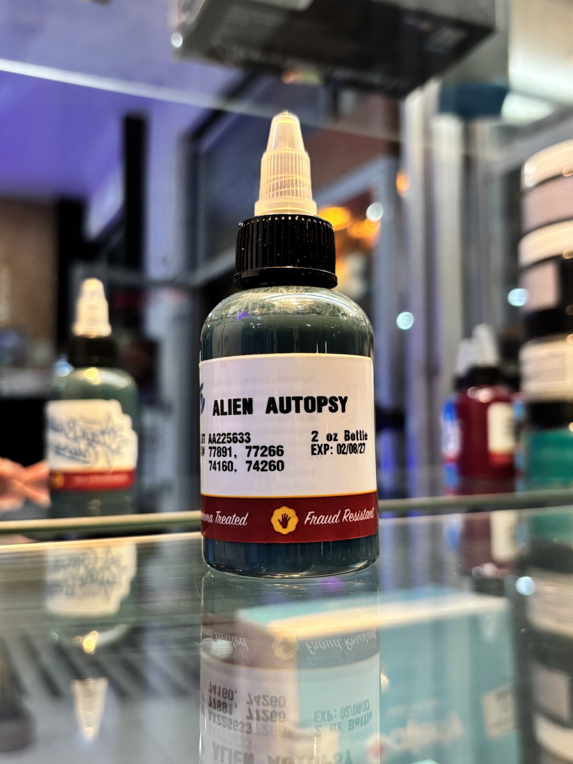 Alien Autopsy es una tinta profesional para tatuaje de verde ácido y experimental, creada para piezas fuera de lo convencional. Su pigmentación intensa genera alto impacto visual.